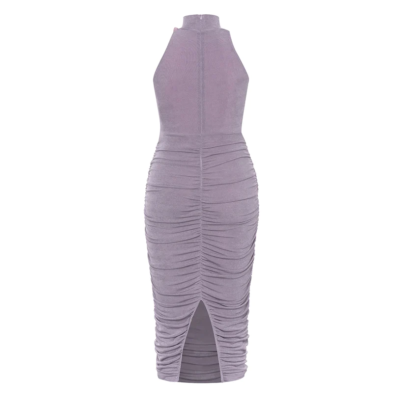 Abito da donna senza maniche, con un raffinato colletto alto, in una delicata tonalità di viola chiaro. La lunghezza fino al ginocchio conferisce un’eleganza contemporanea, mentre il taglio aderente esalta la silhouette in modo delicato.
